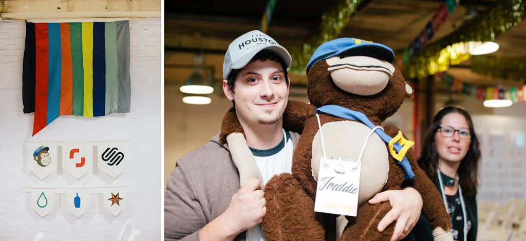 I hand-painted and constructed a series of six canvas flags for each of our global summit sponsors: Mail Chimp, ShutterStock, SquareSpace, Moo, Blue Bottle Coffee, and SixPoint Brewery. I also sewed a huge CreativeMornings logo flag.