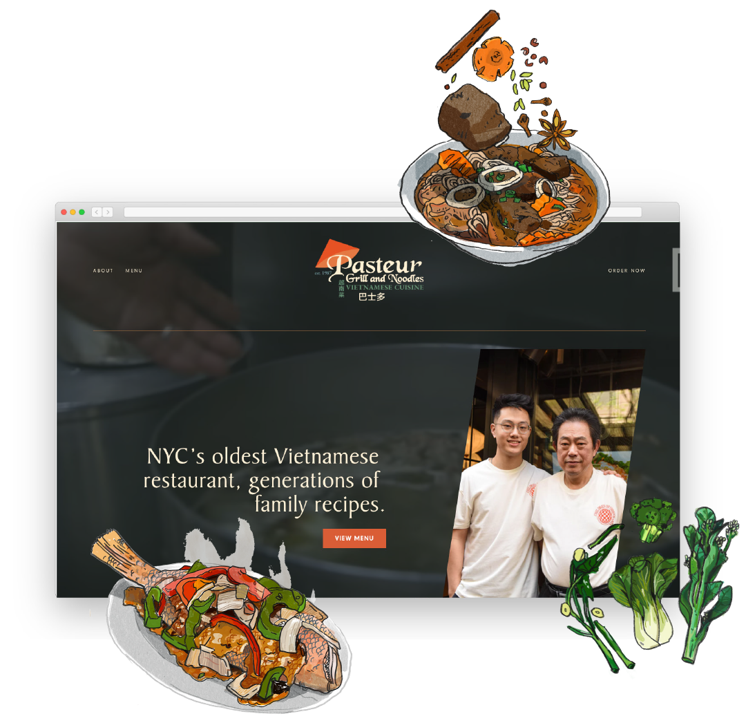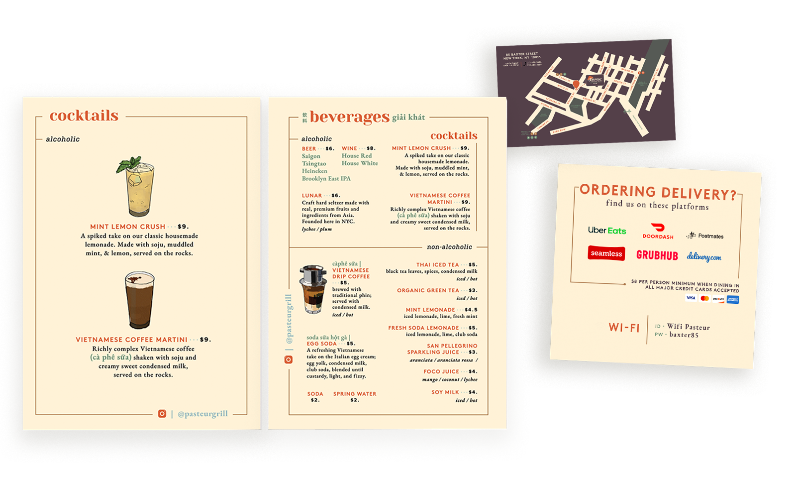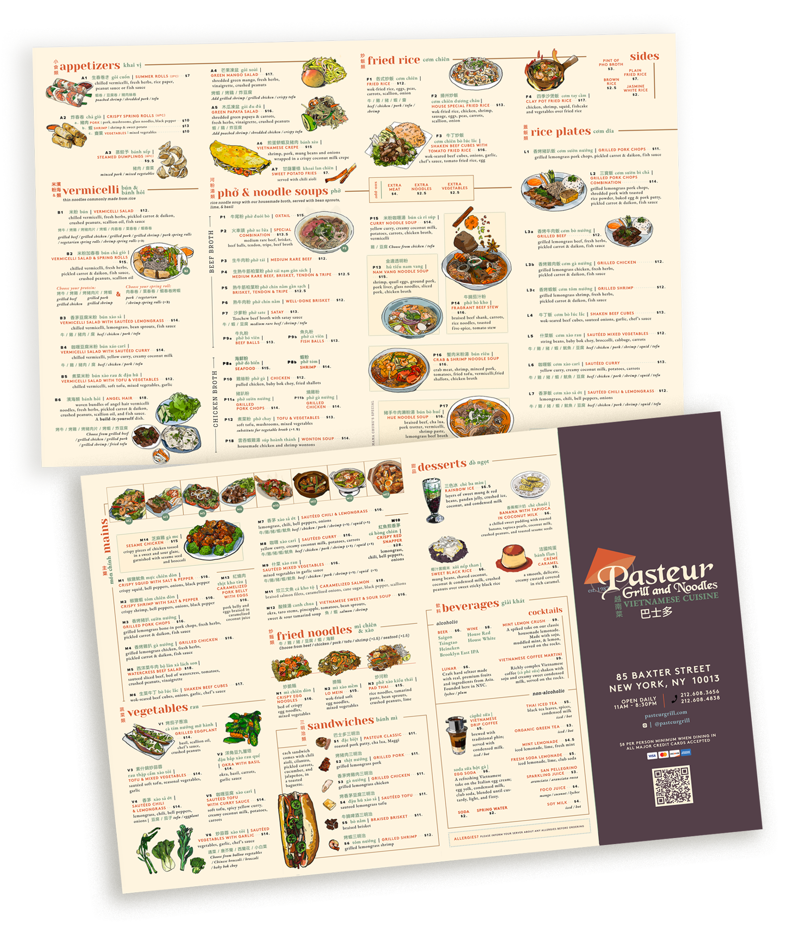 The new menu remains tri-lingual, in English, Chinese, and Vietnamese, to accommodate Pasteur’s regular customers in it’s diverse community. This menu is also multi-functional as both a foldable takeaway menu and two-sided dine-in menu. Outdated busy photographs are swapped with 52 custom hand-drawn illustrations of their menu highlights, curated by the kitchen team. Full-color allowed us to add play and lightness to the menu (since we anticipated lots of descriptive text), while still staying true to accessibility, for two of their main customers: one who might be orders take-out quickly or already knows their go-to order, and one isn’t familiar with the Vietnamese ingredients and might need a bit more guidance.